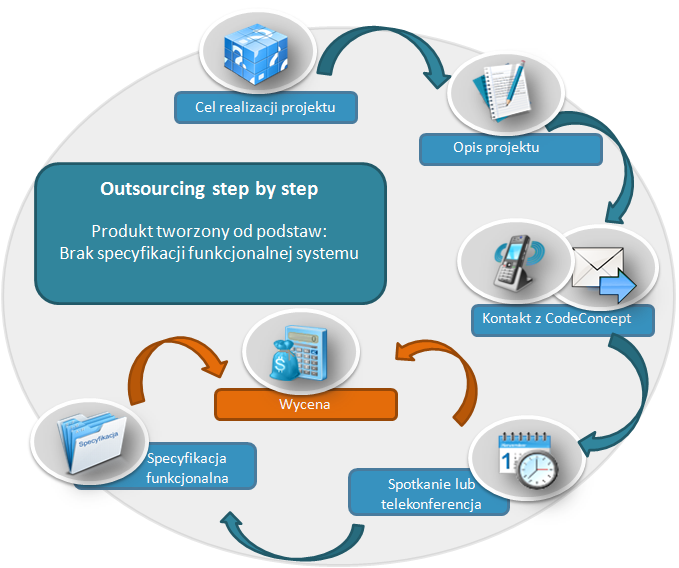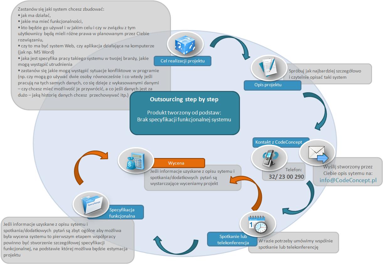 Poniższy wykres przedstawia kolejność działań jakie należy podjąć aby zlecić usługę stworzenia produktu od podstaw, nie mając specyfikacji funkcjonalnej systemu. Po kliknięciu na wykres otworzy się okno ze szczegółowym opisem każdego z kroków.