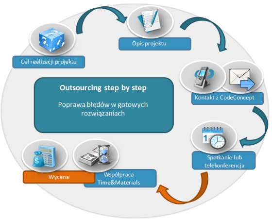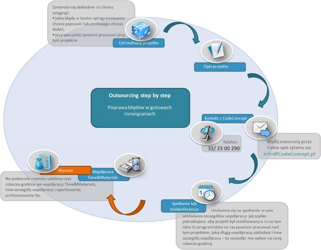 Poniższy wykres przedstawia kolejność działań jakie należy podjąć aby zlecić usługę poprawy błędów w gotowych systemach. Po kliknięciu na wykres otworzy się okno ze szczegółowym opisem każdego z kroków.